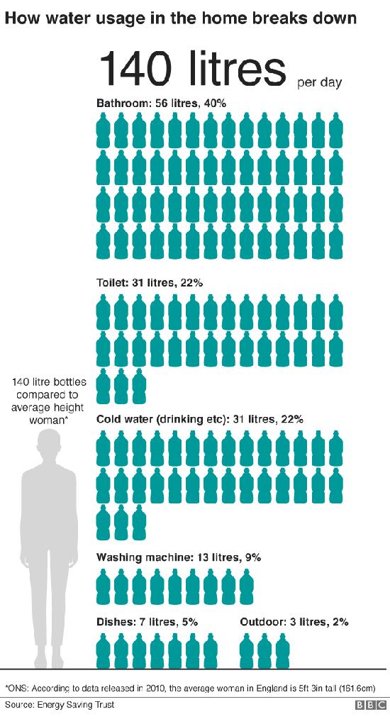 目前英国人平均每天使用量为140升。环境署表示,它将与政府和业界合作建立个人用水目标,并提出符合成本效益的措施。